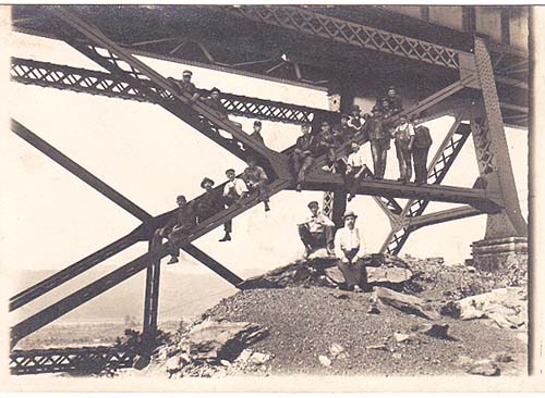 [Group posing beneath a bridge]