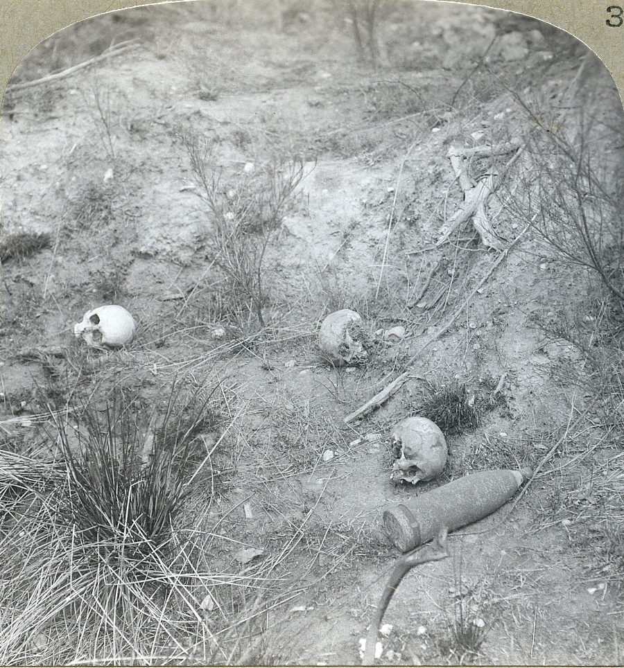Grim relics of the sanguinary struggle round Ypres, skulls on the battlefield of Hooge.