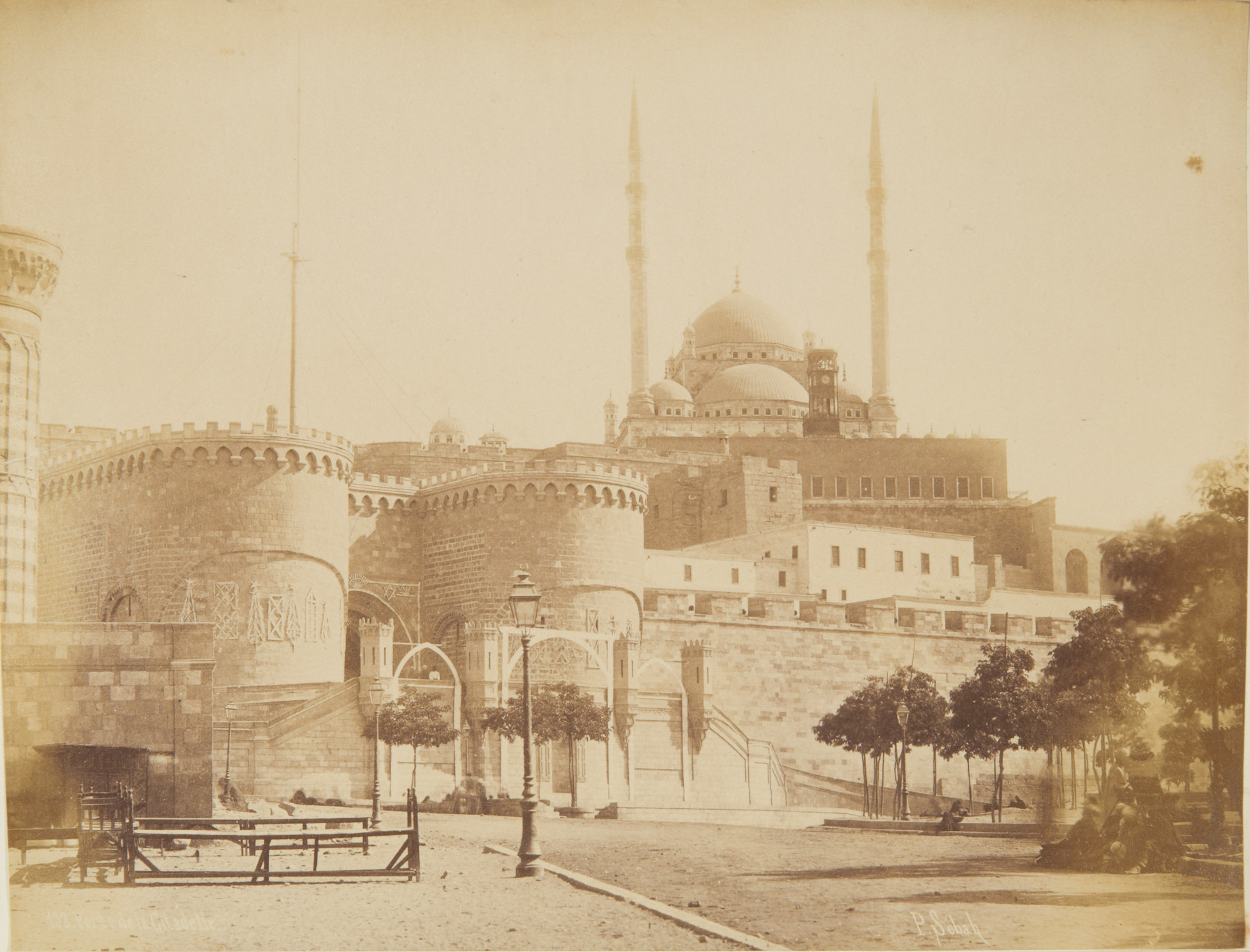 Photograph of Cairo: minaret and dome of mosque rising above buildings of town, behind castellated walls and gatehouse of the Citadel (built by Saladin) with flanking drum towers; in foreground is road lined with small trees; blurred group of men, foreground right.
