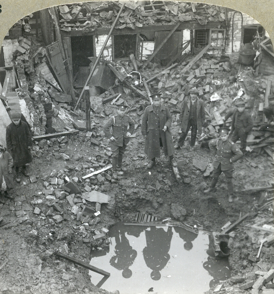 Baby-killers' work, enormous hole and shattered houses caused by a Zeppelin bomb.