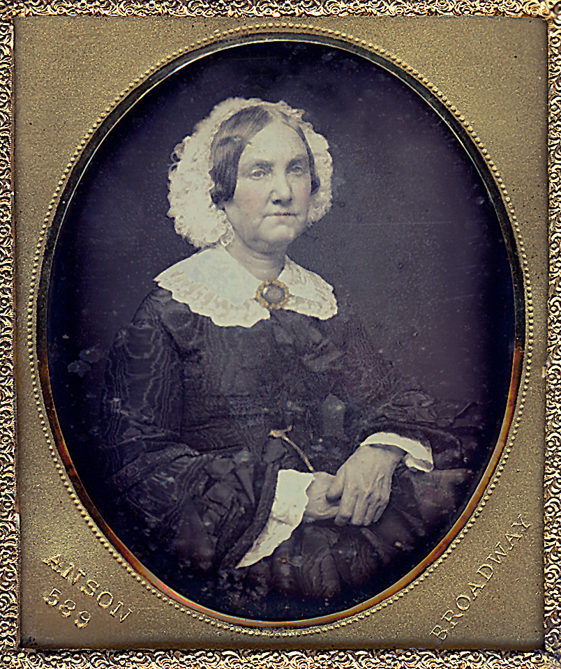 The unusual case opens to reveal a 1/2 plate ambrotype of three sisters in the center. In the left panel there are two 1/6 plate daguerreotypes. One is a lovely image of a mother holding a tiny baby. (There is dust on the underside of the glass.) Below that is a 1/6 plate daguerreotype of a woman, by Anson. Possibly she is the mother of the first image. The right panel has, on top, a superb 1/6 plate by Anson, a close portrait of a girl in ringlets, with bows on her dress tinted red. Beneath is another 1/6 plate in a stippled octagonal mat, of a woman in a bonnet holding a case. This again could be the mother.