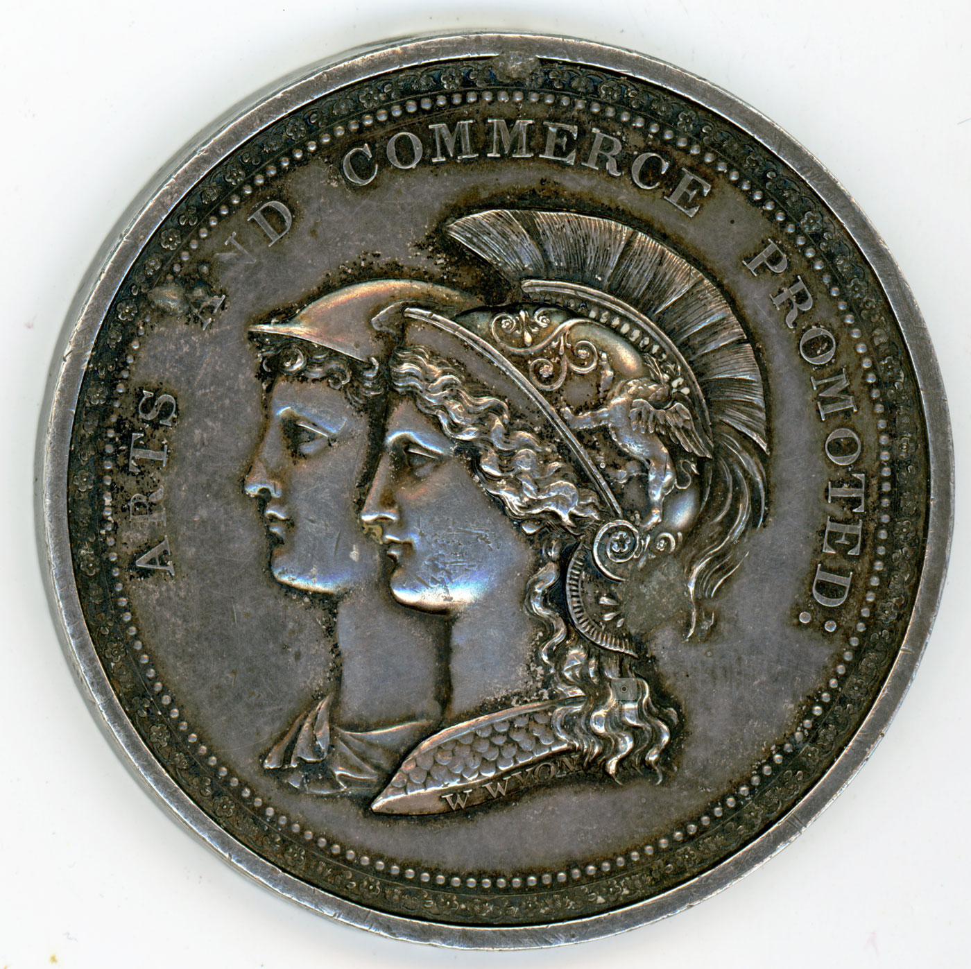 Private collection of Jason David Wright1850 Society of Arts Silver (massive 52mm of solid silver) Medal, Presented to Antoine Francois Jean Claudet - Society of Arts Silver Medal, by William Wyon at the Royal Mint, London, dated 1850, medal with Busts facing left of Scientia superposing Mercury border is a band of alternating thistle, rose, and shamrock, engraved to the rear 'ANTOINE FRANCOIS JEAN CLAUDETT, 1850, For his Machines for Cutting Glass' Antoine François Jean Claudet (August 18, 1797 - December 27, 1867), was a French photographer and artist who lived and worked in London, he produced some of the best daguerreotypes of the Victorian era, it has been estimated that he made around 1,800 images every year with subjects including Royalty, Michael Faraday, Charles Babbage plus many other famous Victorians. Antoine Claudet was born in Leyon, France in August 1797 at the end of the French Revolution. He moved to Paris when he was 21 and worked for his uncle at a bank. While in Paris he met and married a French woman whose family had moved to England. In 1825 Claudet was given the job of co-director by his wife's nephew, George Bontemps of M. Ponces Grimbolt's glass works just outside of Paris. Then in 1823 he moved to 89 High Holborn, London to import glass shades and sheets manufactured back in France. It was through this introduction to the glass industry that allowed Claudet to demonstrate his creative skills in inventing. In 1833 he invented a machine for cutting cylindrical glass. It was for this invention he was finally awarded, in 1853, this Society of Arts Silver medal by Price Albert and elected a fellow of the Royal Society. In 1839, having heard about Louis Daguerre's photographic discovery, Claudet travelled to Paris and took lessons on the process from Daguerre himself. Claudette learnt the whole process and bought a licence for the then impressive sum of £200.00, Claudet was the first person in England to be able to perform the Daguerre process. In 1877, a year after Claudet's death his entire studio was destroyed by fire with the loss of 20,000 negatives, daguerreotypes and prints. Interestingly this medal shows heat damage with some bleeding of the silver due to exposure to high temperature. It is safe to assume that this medal was kept at Claudet's studio and was caught in the fire. The medal is, perhaps, the only surviving personal effect of Antoine Francois Jean Claudet known to exist.
