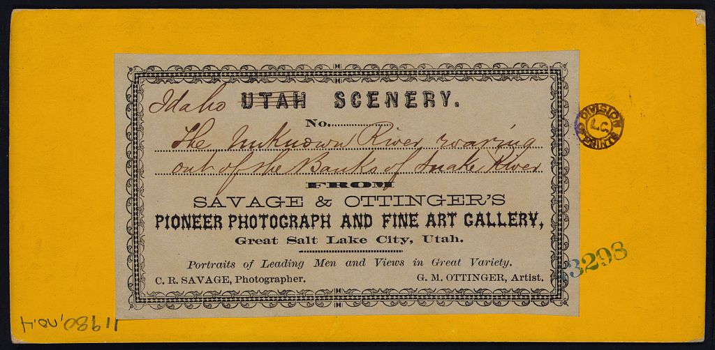 Savage & Ottinger 1861-1870 Back label for "The Unknown River Roaring out of the Banks of Snake River" - "Idaho Scenery."