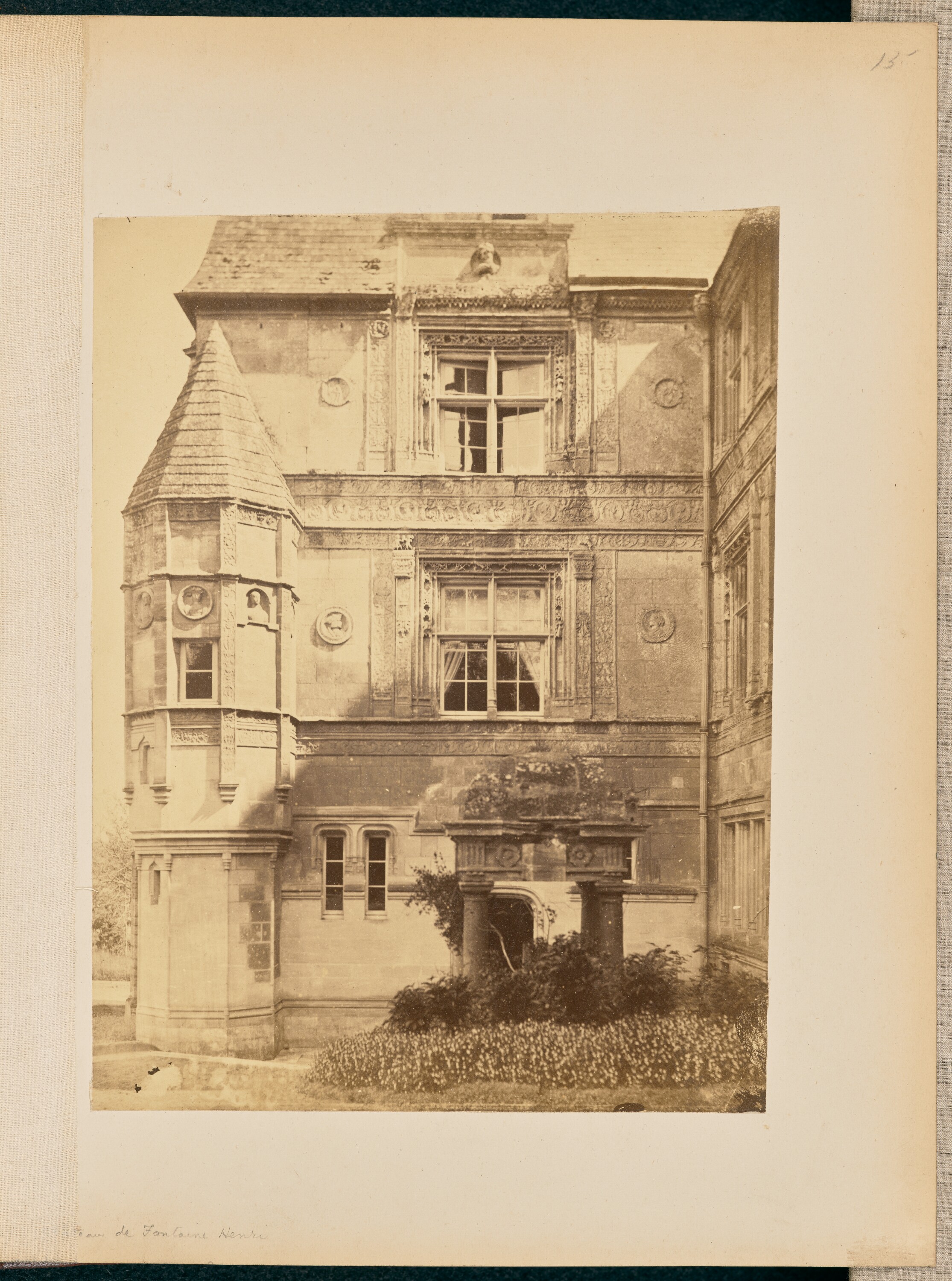 View of an inner corner of the Château de Fontaine-Henry. The building features carved medallions with different figures, mostly in profile, and a polygonal tower on one corner displays a bust set into an arched recess. Trim around the windows and between the ground, first, and second floors, features detailed carvings.