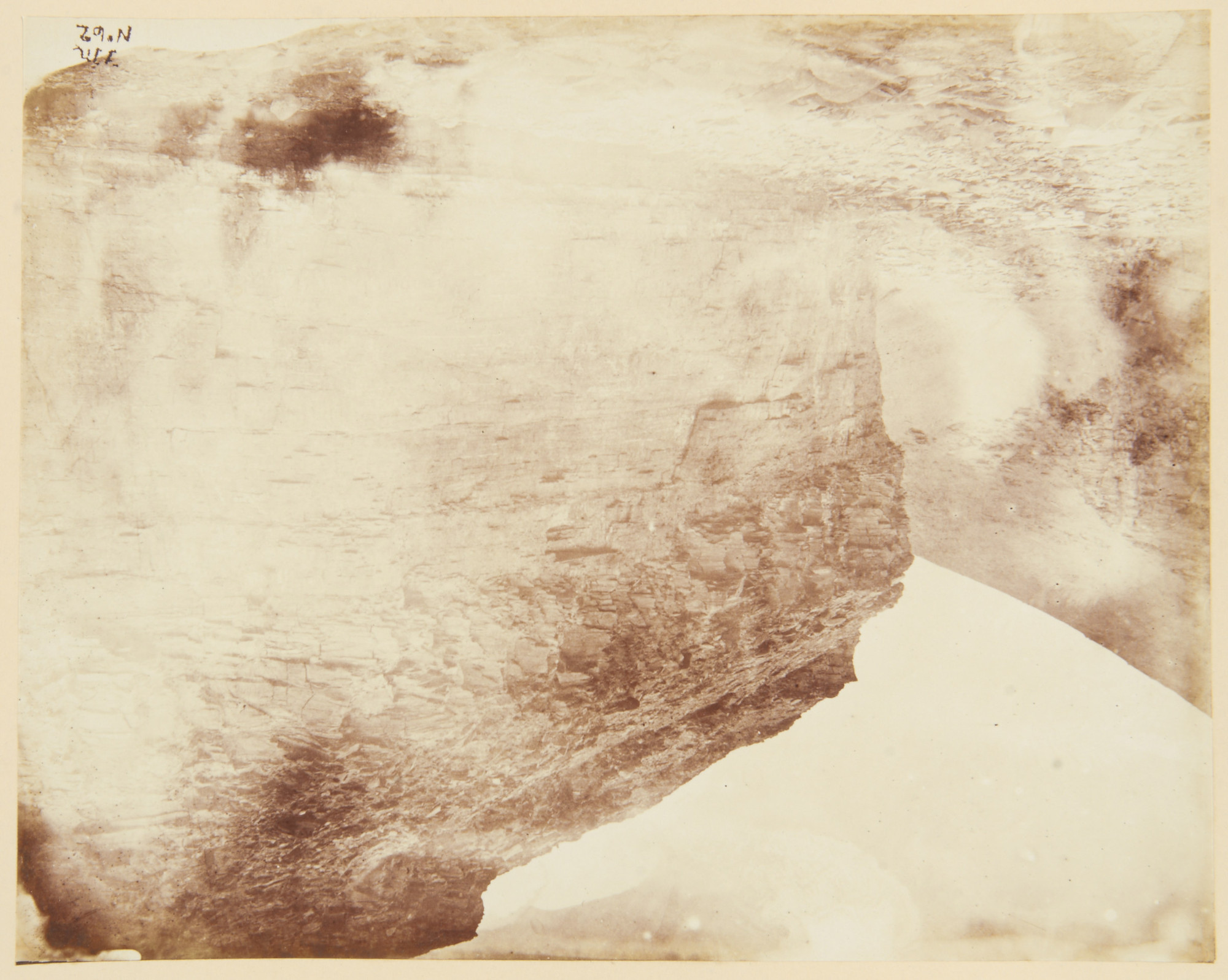 Photograph of close up view of cliff face, consisting of coal. Photographer's inititals in lower right corner.
