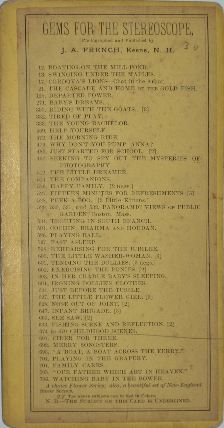 Backlist for "Gems for the Stereoscope. Photographed and published by J.A. French, Keene, N.H."