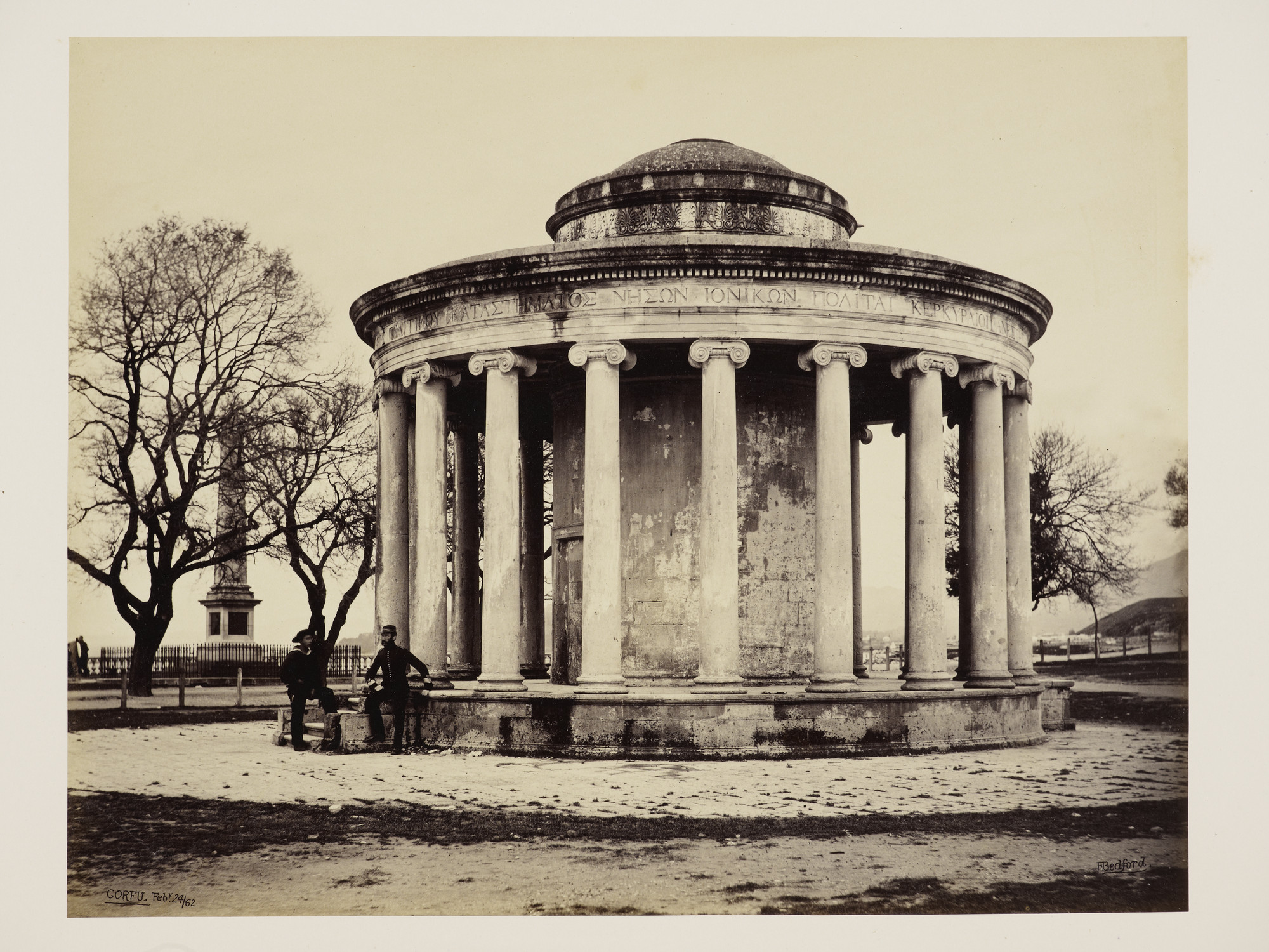Corfu. Memorial to Lieutenant-General Sir Thomas Maitland (1759-1824), with colonnade around exterior. Obelisk to Sir Howard Douglas (1776-1861) visible through trees on left. Maitland was the Governor of Corfu, as Lord High Commissioner of the Ionian Islands, 1815-23. Douglas also served as the Lord High Commissioner, 1835-40. The photograph is signed, captioned and dated in the negative, 'F Bedford Corfu'. The number in the Day & Son series is 134.