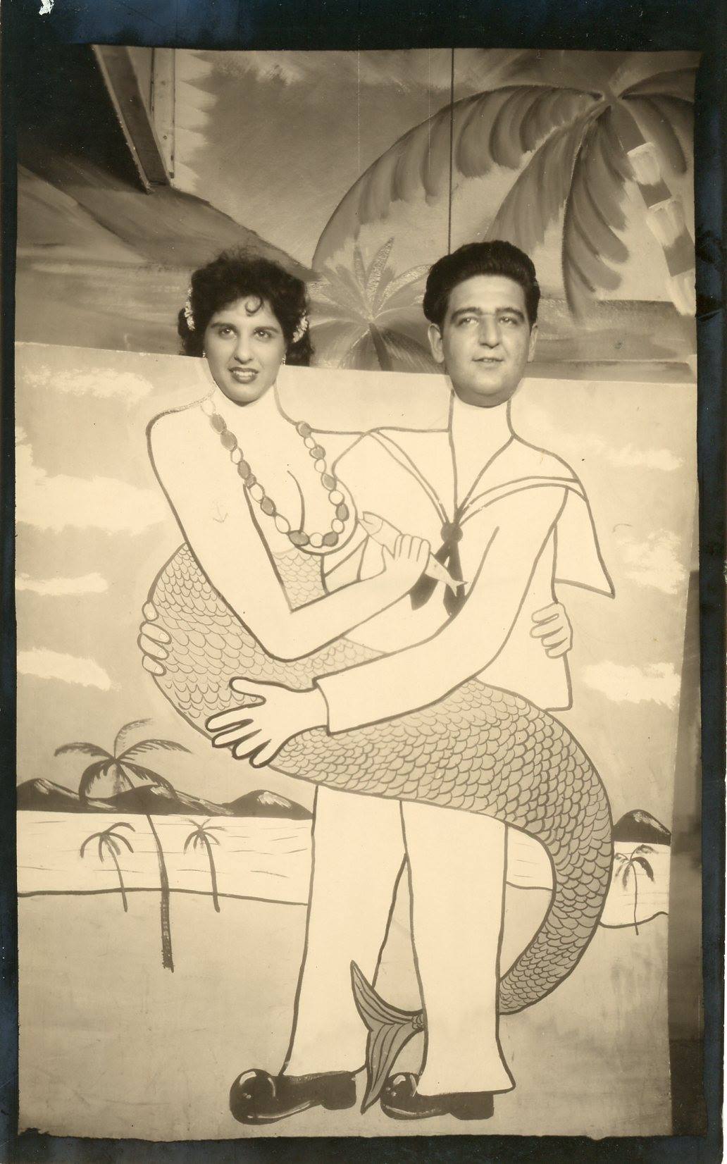 A man and a woman behind a foreground painting of a mermaid and a sailor