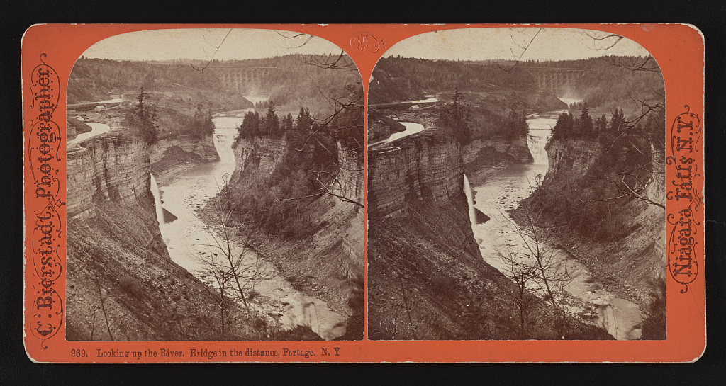 Looking up the River, Bridge in the distance, Portage, N. Y.