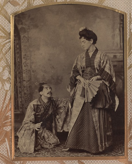 Portrait of a man and a woman in Japanese clothing the woman holding a fan