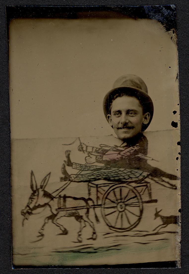 Head of man in derby hat behind cloth with painted body and scene (donkey cart)