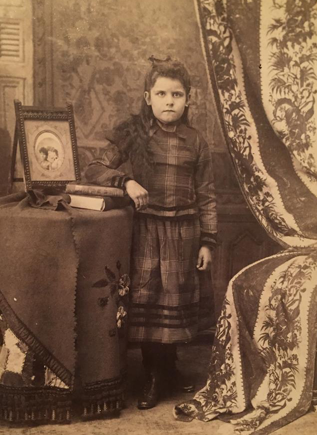 Studio portrait of a standing girl with a framed photograph beside her