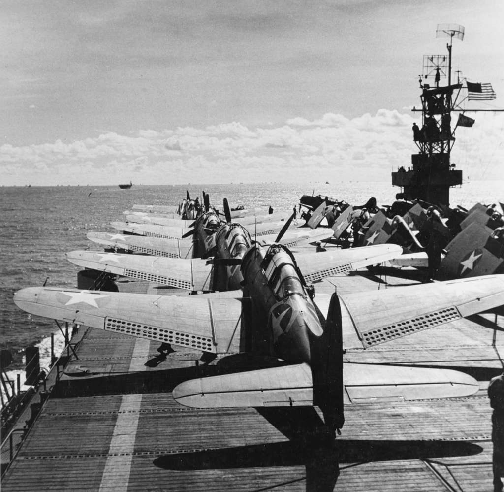 U.S. Navy Douglas SBD-3 Dauntless dive bombers and Grumman F4F-4 Wildcat fighters on the flight deck of the escort carrier USS Santee (ACV-29) during Operation Torch