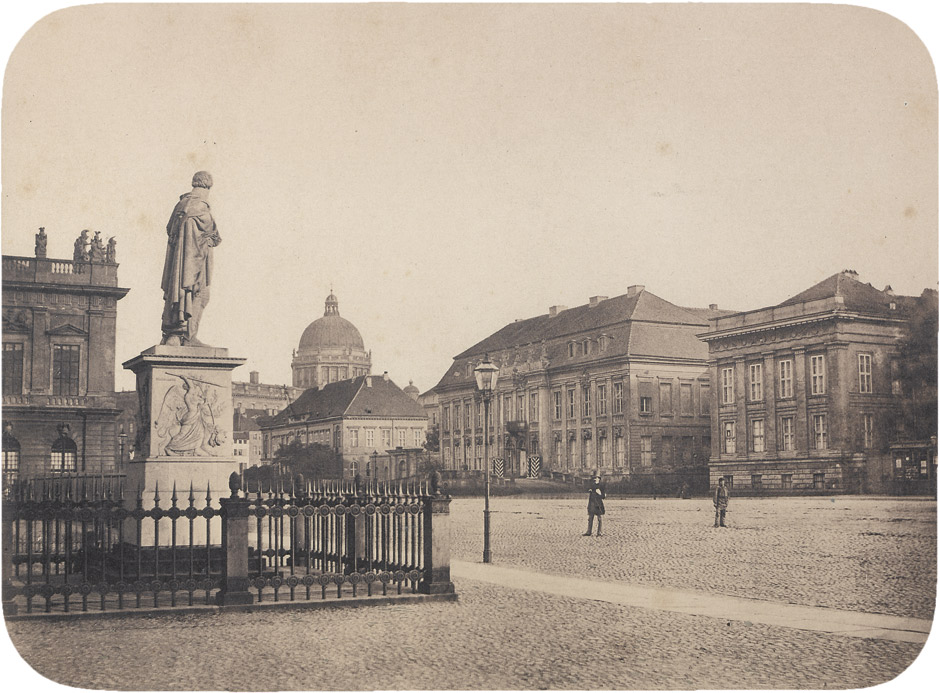 When he took this photograph Leopold Ahrendts was standing next to the Neue Wache and the Bülow statue which figures prominently in the left side of the image. At the center of the image is the impressive dome of the Castle (built 1845 - 1853) and to the right is the Kronprinzenpalais still before its reconstruction in 1856-57.