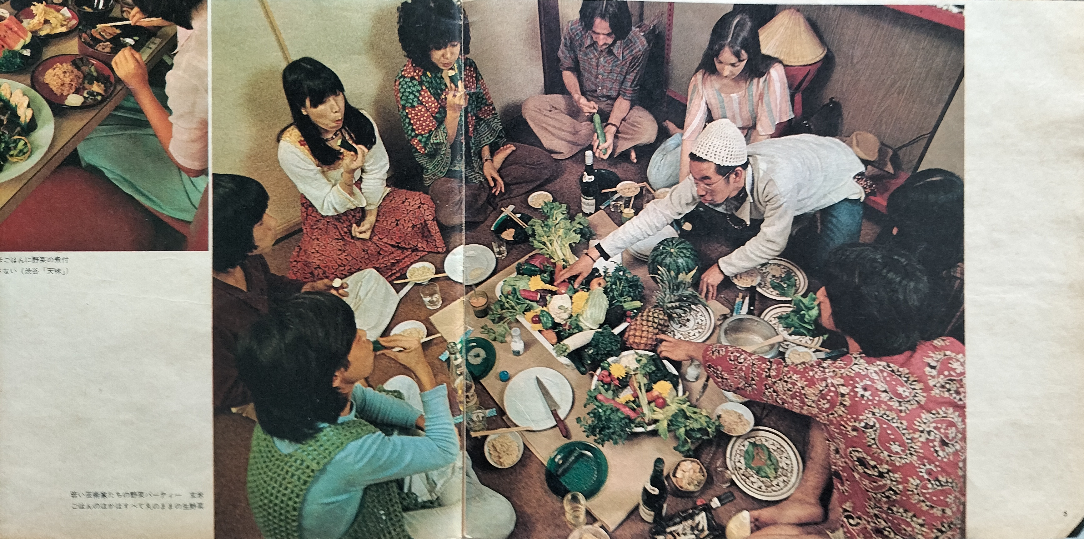 Magazine page spread Private collection of Paul Nolan (Paul Nolan, pers. Email, 22 August 2025) Published in Asahi graphic mag. 1975 at the Vegetable party photographed by Otsuka san for the article on Vegetarians which I was at the time.That's me top centre with a cucumber. Our Japanese friends were all photographers and political science students. Otsuka would give out free film and he founded a photo Gallery called Q-Blick (Kubrick) where these young Japanese photographers could work in the darkroom and show work.