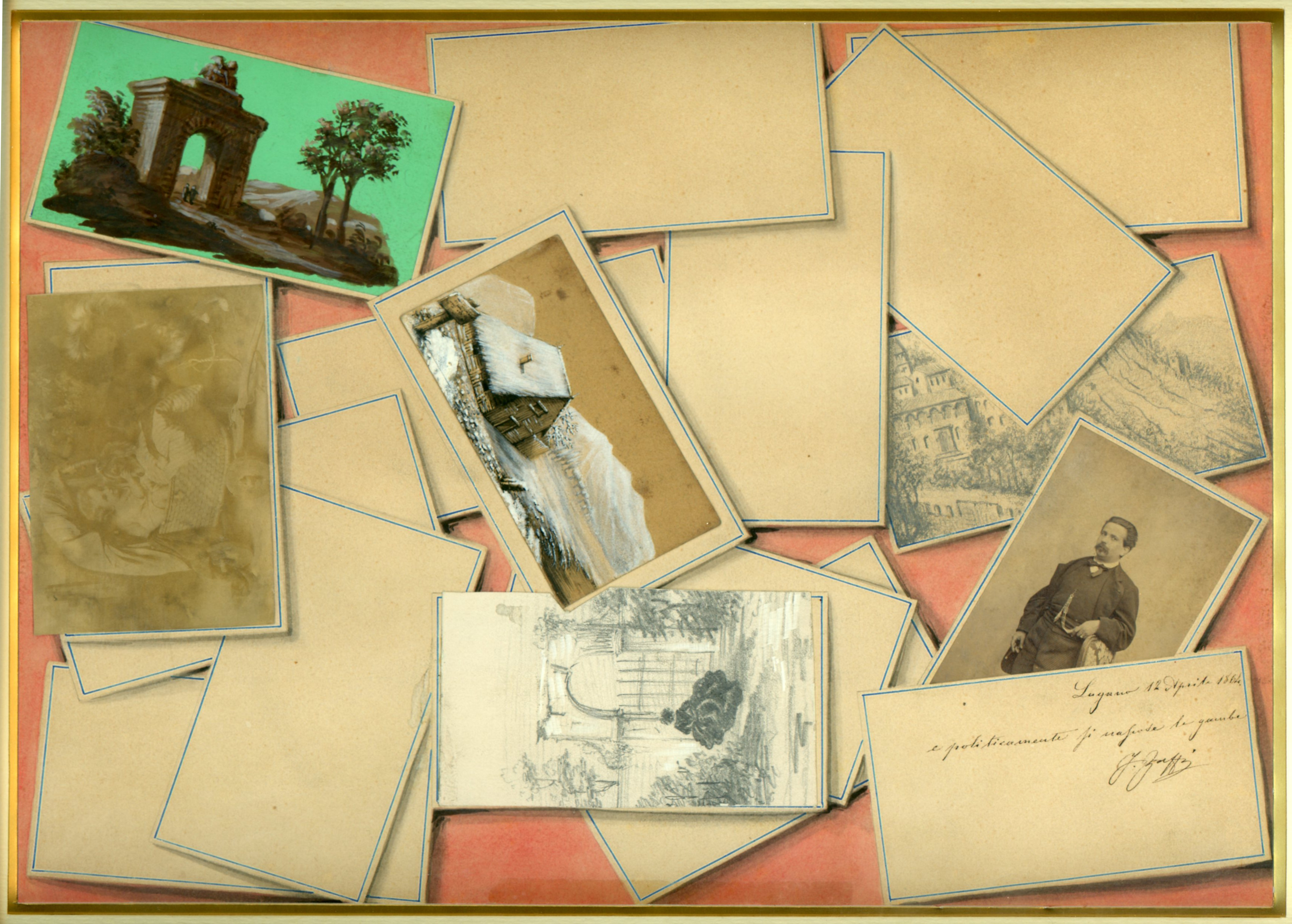 In this Italian trompe l'oeil of cartes-de-visite scattered on a pink tablecloth, there are two actual photographs, two copies of photographic views, two pencil sketches, ten blank cards, and one carte covering the legs of the man in the portrait on which is written: Lugano, 12th April, 1864. And he wisely (politically in Italian) hid his legs. J. Saffi.