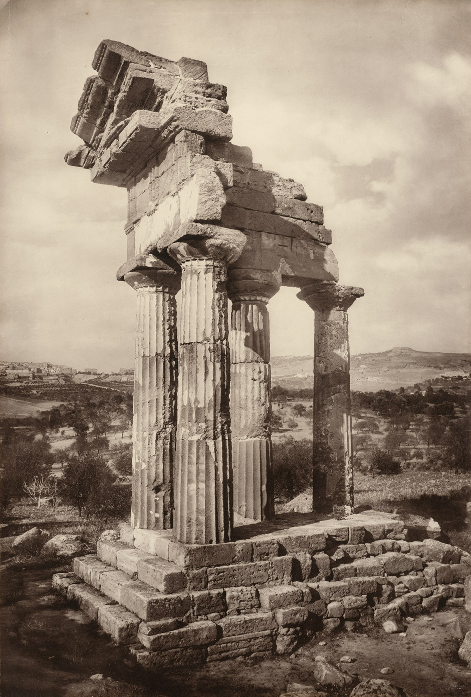 The reconstructed corner of the "Castor and Pollux" Temple in Agrigento, Sicily, Italy