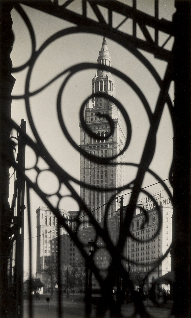 This photograph, which is featured in Margaret Bourke-White, Photographer of Design 1927-1936, depicts the soaring structure with a unique overlaid iron design element that alludes to the city's industrial heritage. Signage advertising the Hotel Cleveland appears in the background, behind the tower's solid rectilinear forms.