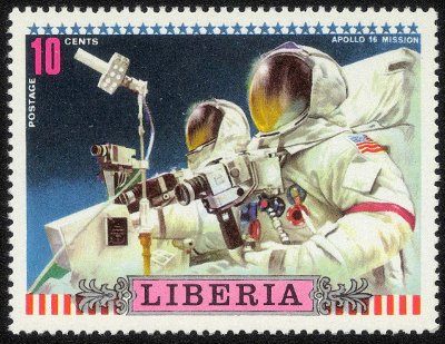 Liberia postage stamp honoring astronauts of Apollo 16 mission. Part of a 6-stamp set. It shows two astrononauts - one holding a Hasselblad EDC.