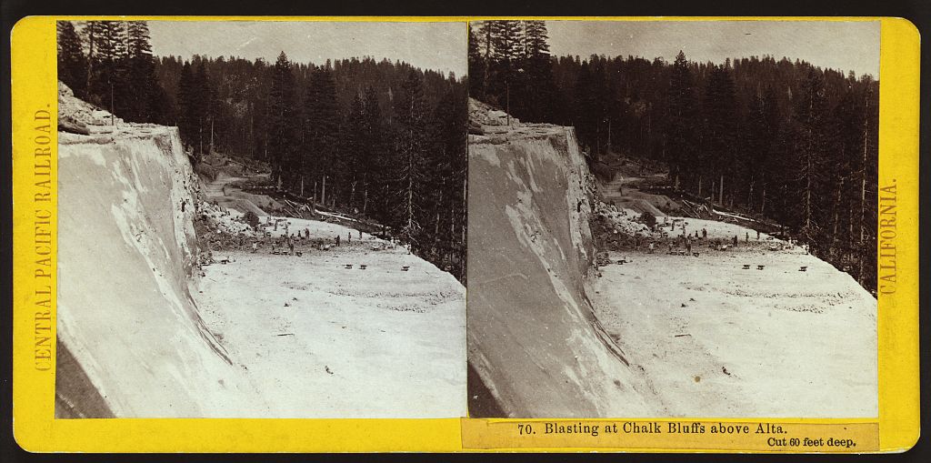 Alfred Hart 1865-1869 Blasting at Chalk Bluffs above Alta. Cut 60 feet deep [Central Pacific Railroad, California. Scenes in the Sierra Nevada Mountains. No. 000]