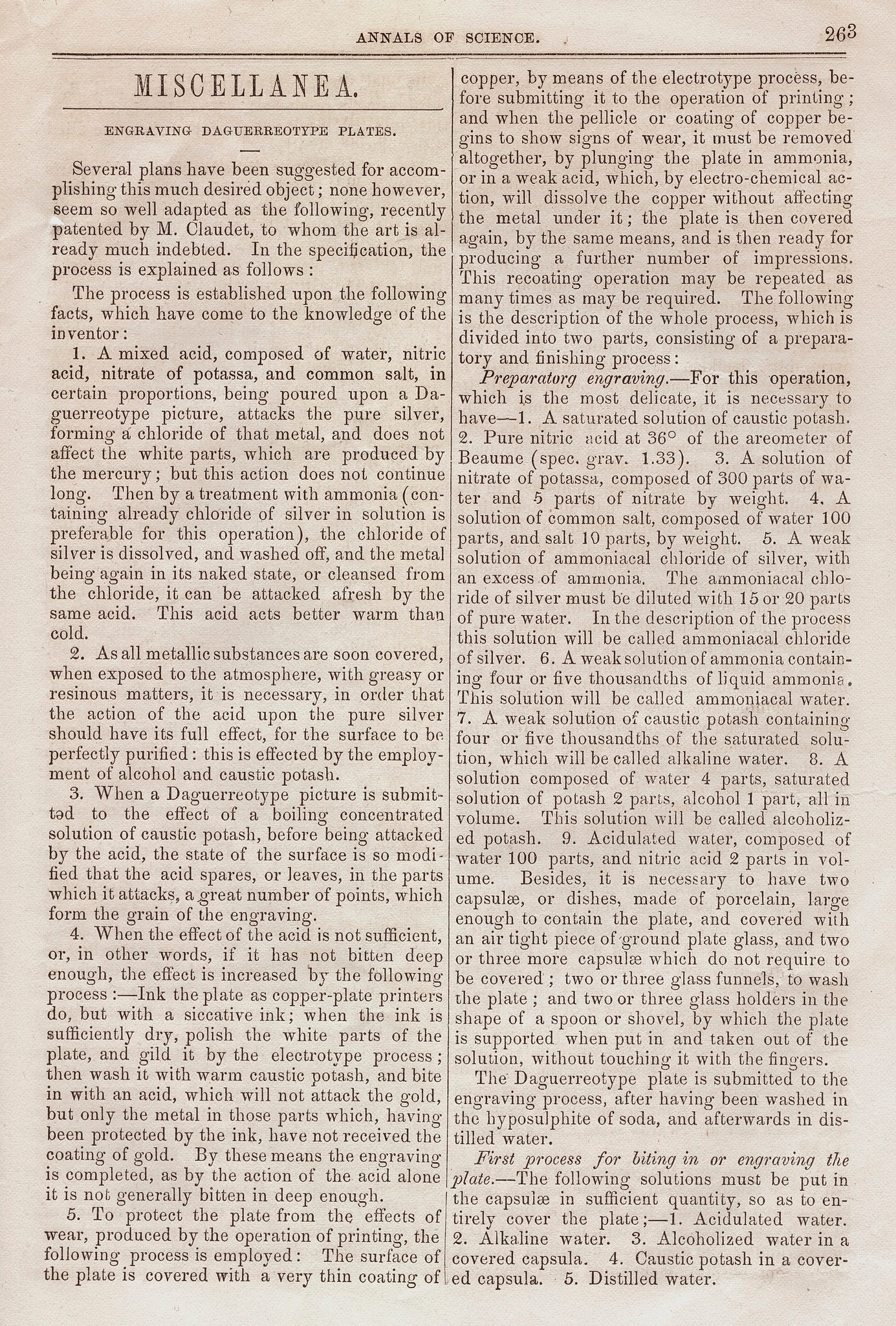 - When a Daguerreotype picture is submitted to the effect of a boiling concentrated solution of caustic potash, before being attacked by the acid, the state of the surface is so modified that the acid cleans, or leaves, in the parts which it attacks, a great number of points, which form the grain of the engraving.