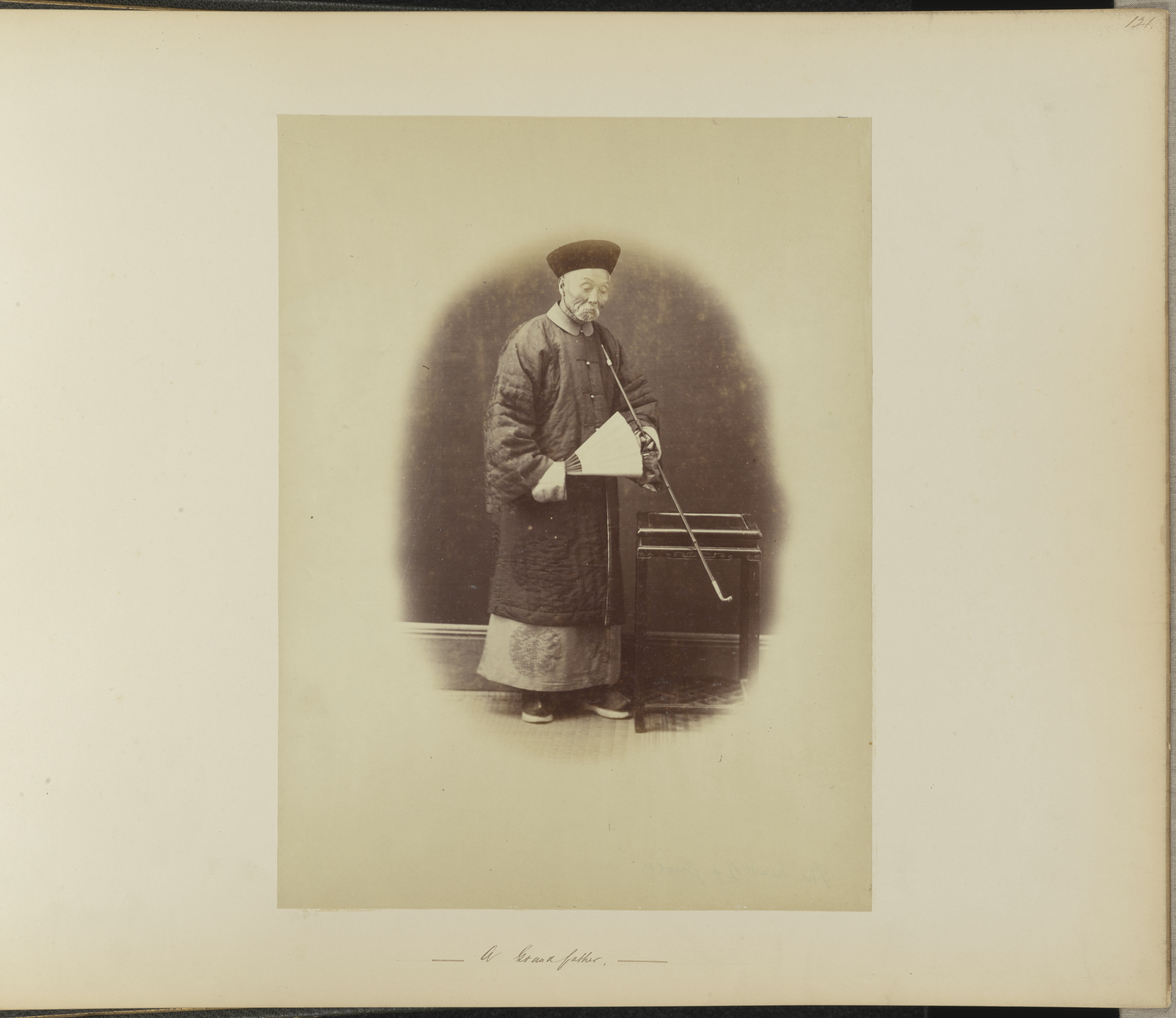 Full-length portrait of an elderly man wearing a traditional Chinese padded coat. He stands next to a square table, holding a fan in one hand and a long smoking pipe in the other.
