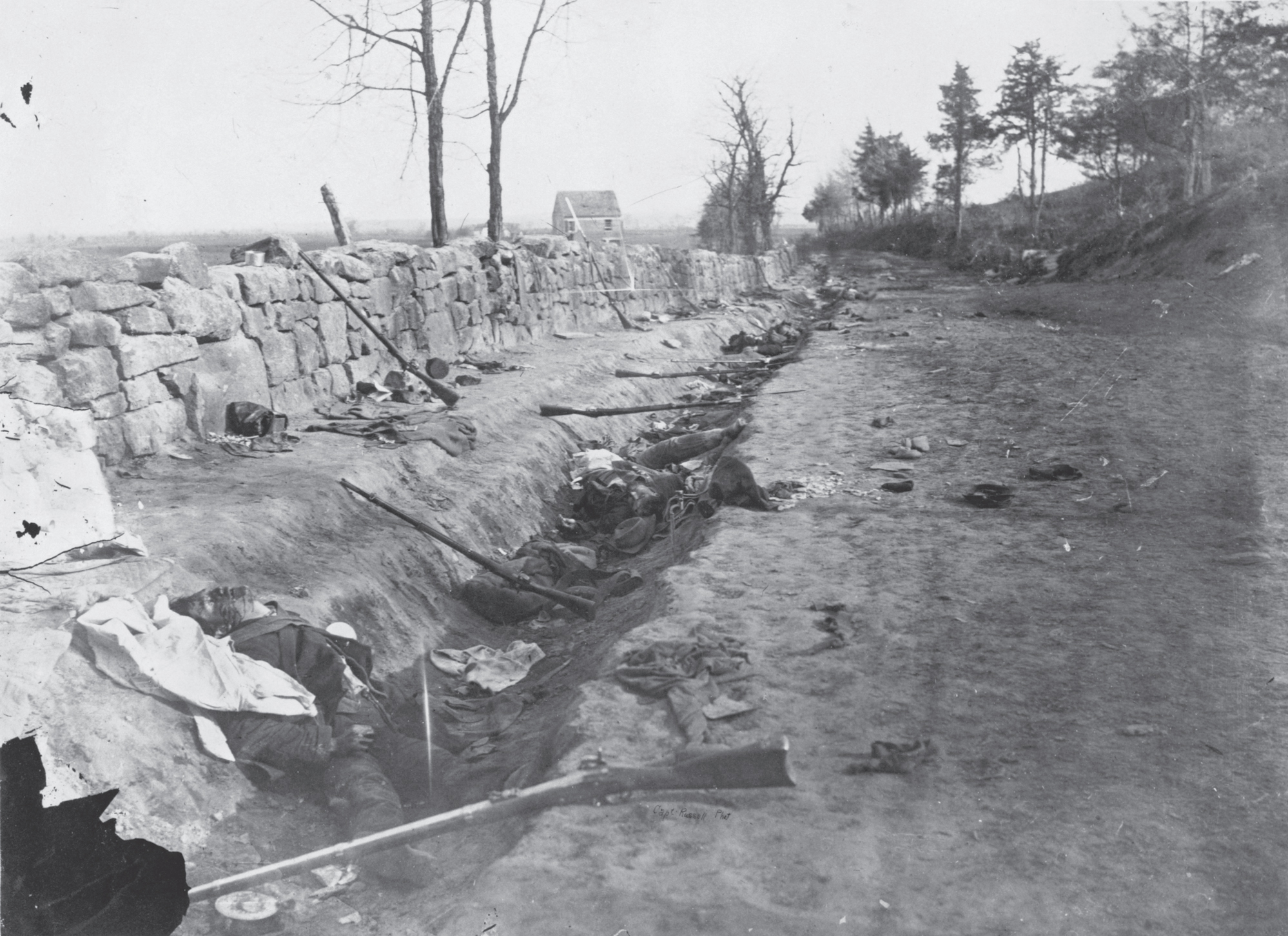 J. Paul Getty Museum In this view we are confronted with the bloody face of a dead soldier, lying on his back in a shallow ditch, next to his rifle. Our sight line leads us down the ditch of crumpled, dead soldiers, compositionally reinforced by a parallel stone wall as far as we can see, suggesting an endless line of wrecked manhood.