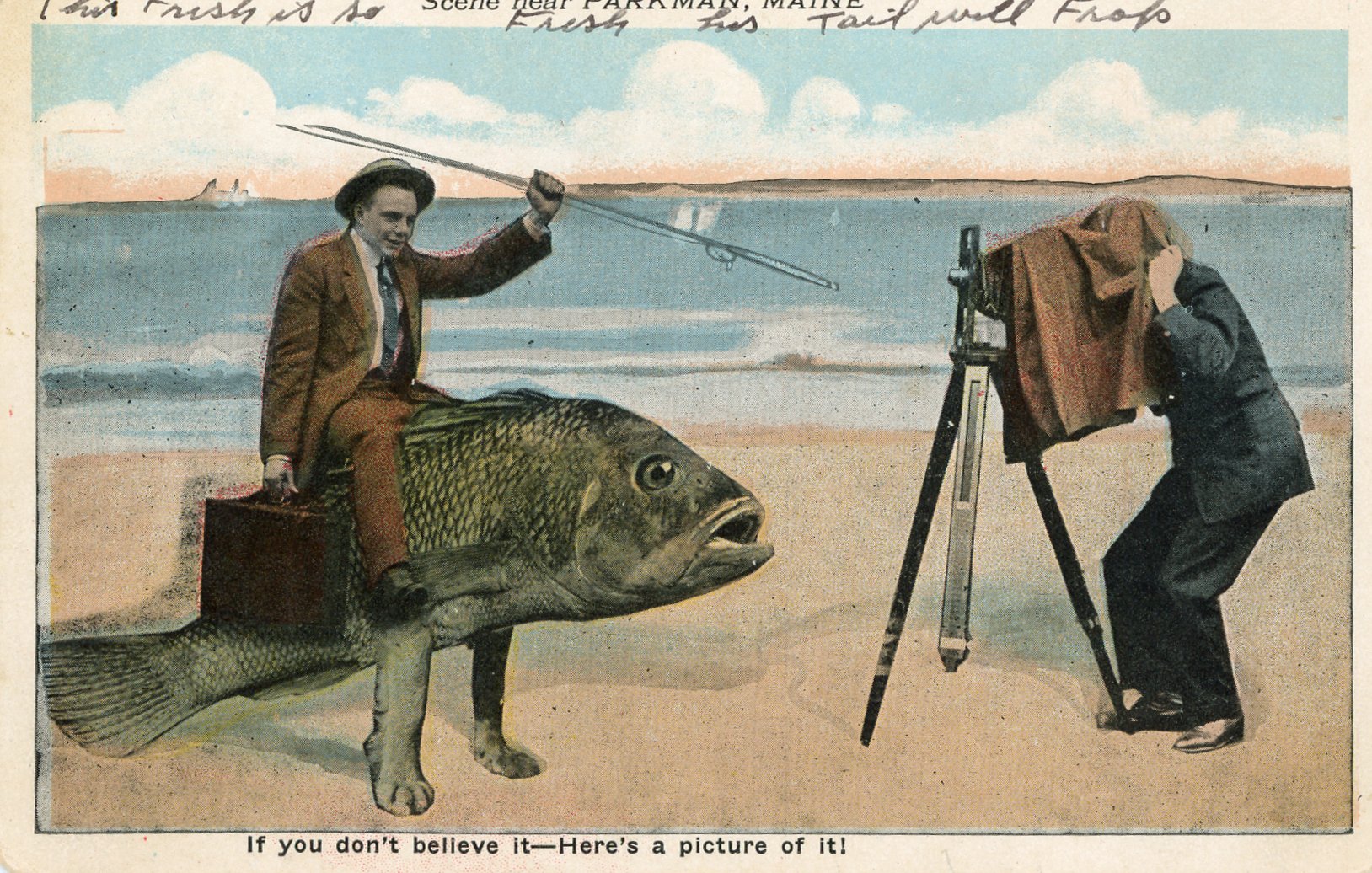 Scene near Parkman, Maine. "If you don't believe it -- Here's a picture of it!" Series 608. Fish Cards