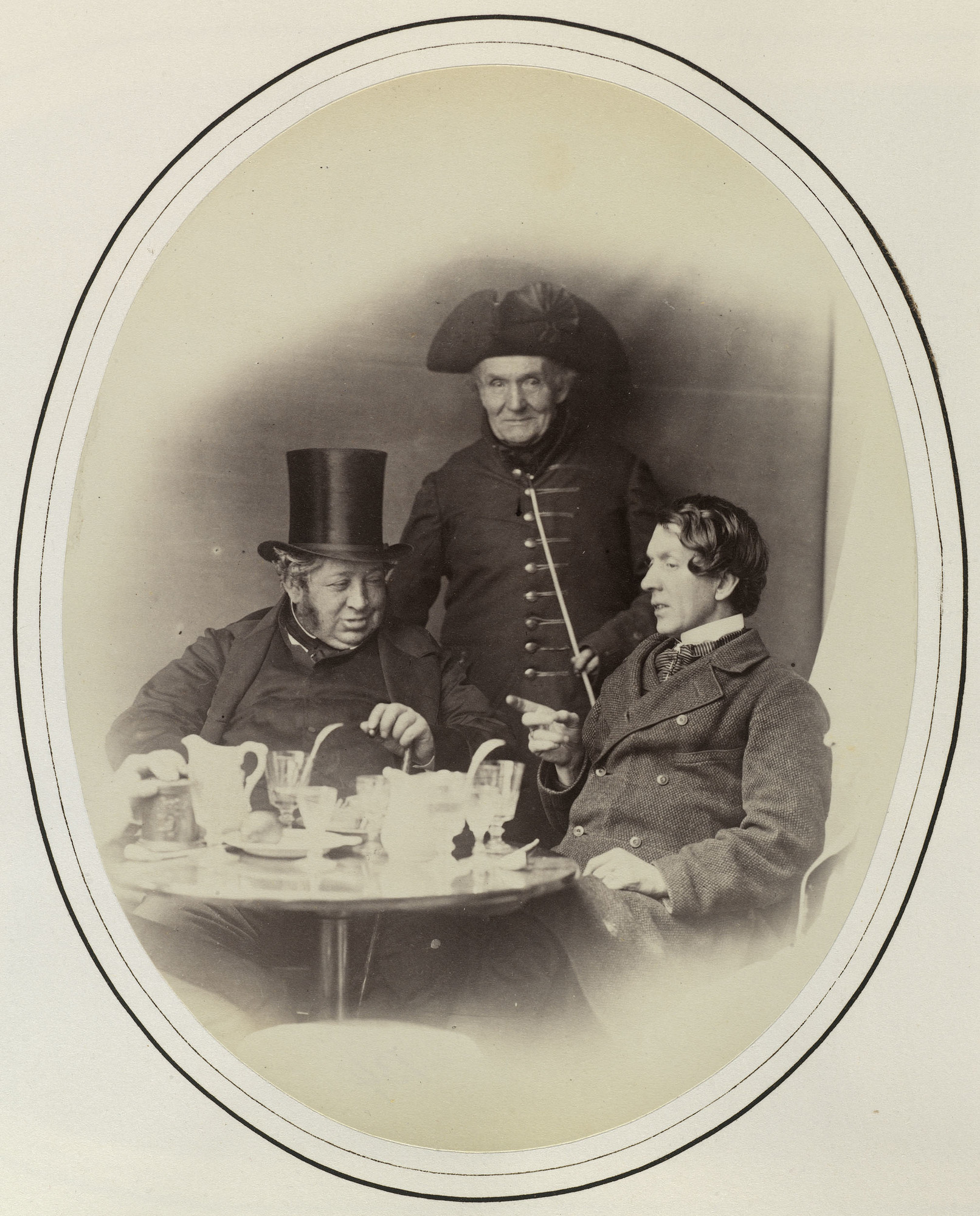 Photograph of a genre piece with three unidentified men gathered around a small table with glasses and jugs on. On the left is seated a man wearing a top hat, facing three-quarters right. In the background stands an elderly man who faces the viewer and who wears a tricorn hat and holds a long clay pipe in his left hand. On the right sits a man in three-quarters left who points at something, undiscernible to the viewer, with his right hand.