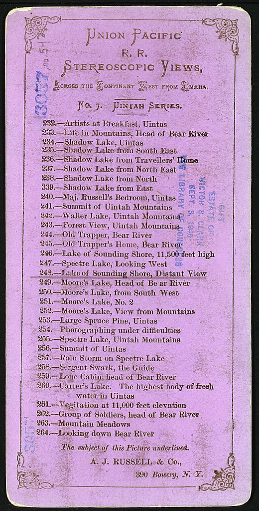 Backlist for "Union Pacific R.R. Stereoscopic Views. Across the Continent West from Omaha." - "No. 7. Uintah Series."