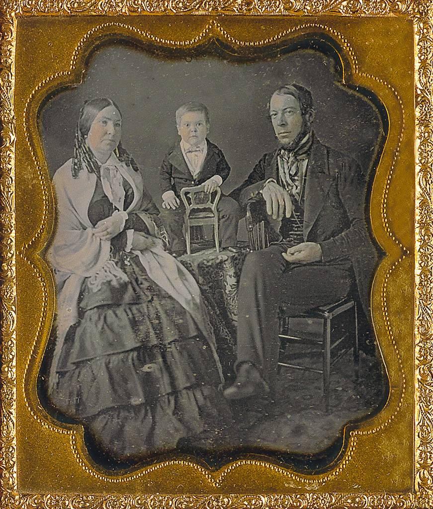 Like many photographers of the daguerreian period, Marcus Root studied painting before dedicating himself to the art of photography. This studio portrait demonstrates a sensitivity to light and composition, and is skillfully hand-tinted to enhance subtle details. A unique portrait, Root arranged the family members in an unusual configuration. Instead of the patriarch of the family occupying center stage, Tom Thumb himself (who is straddling a tiny wooden chair, which is perched atop a circular table) is the focus of the composition. Root's thoughtful arrangement elevates the tiny performer so that he is nearly the same height as his seated parents. In this way, Tom Thumb's status as an international celebrity, and the most financially successful performer in Barnum's troupe, is artfully underscored.