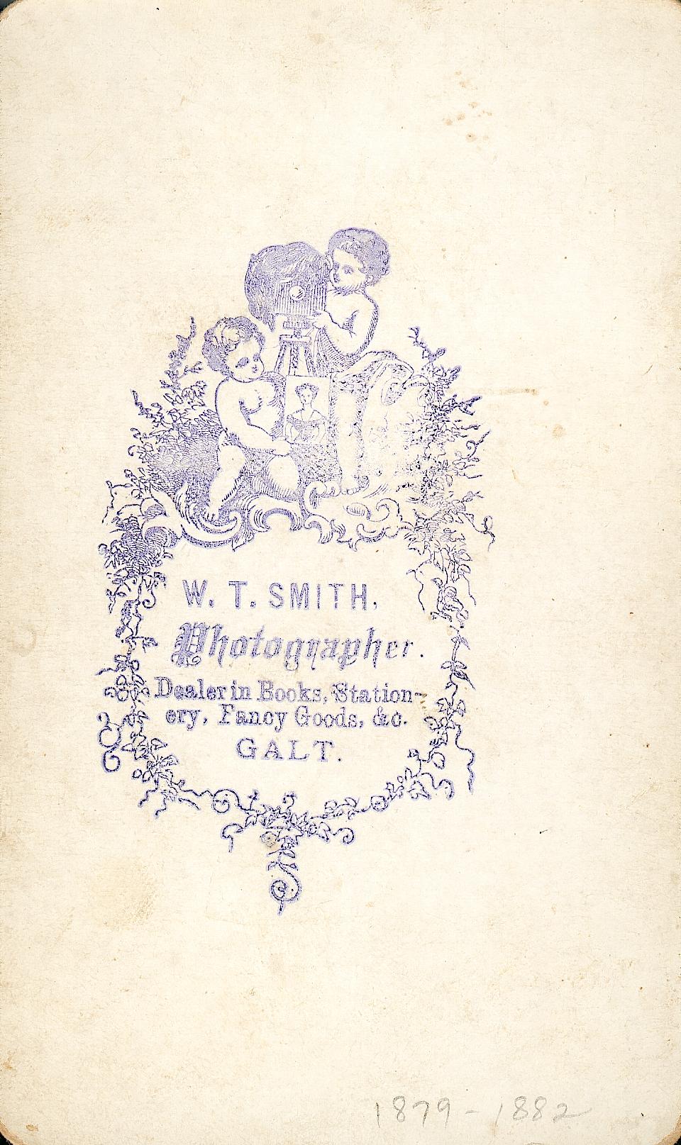 Backmark for "W.T. Smith, Photographer. Dealer in Books, Stationary, Fancy Goods, &c, Galt"