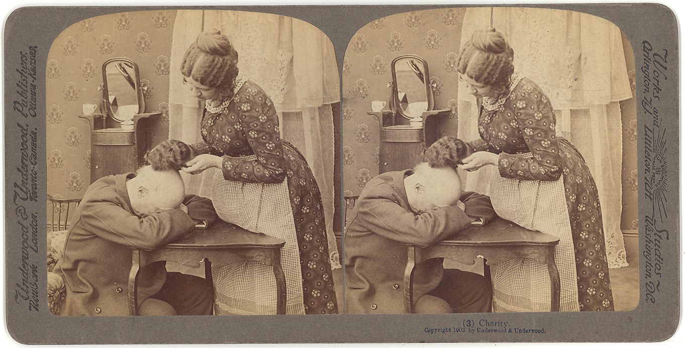 A sympathetic wife offers a hairpiece to her husband after "Dr. Foolems Hair Restorer" has failed to deliver.