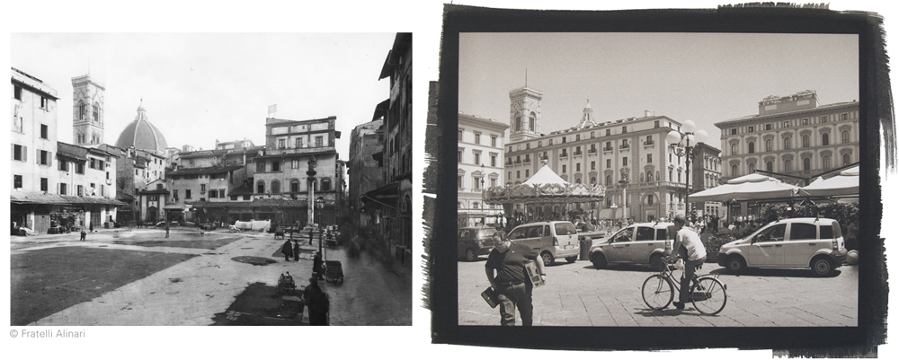 Double Vision: A View of Florence Past & Present" is a Florentine rephotographic project funded by a 2008 Fulbright grant and is based exclusively on the private collections of the world's oldest photo archive, the Fratelli Alinari in Florence, Italy. Retracing the steps of the Alinari photographers, I visited significant sites within the city of Florence, rephotographed them from the same point of view using today's digital technology and then printed the images in platinum/palladium, paying homage to an historical photographic process commonly employed during the time of the Alinari. By pairing the original Alinari print from over a century ago with my current rephotographed version, the project offers a powerful statement of those things that change and also remain the same; a valuable visual contrast and comparison of the Florentine social life, architecture and landscape as it once was and is now today. While the visual research and documentation are based in Florence, the project concepts are internationally applicable. Through this rephotographic project, I hope to build more awareness of the environment by acknowledging our "footprint" and the power we possess to protect and preserve our culture, community and place in history.