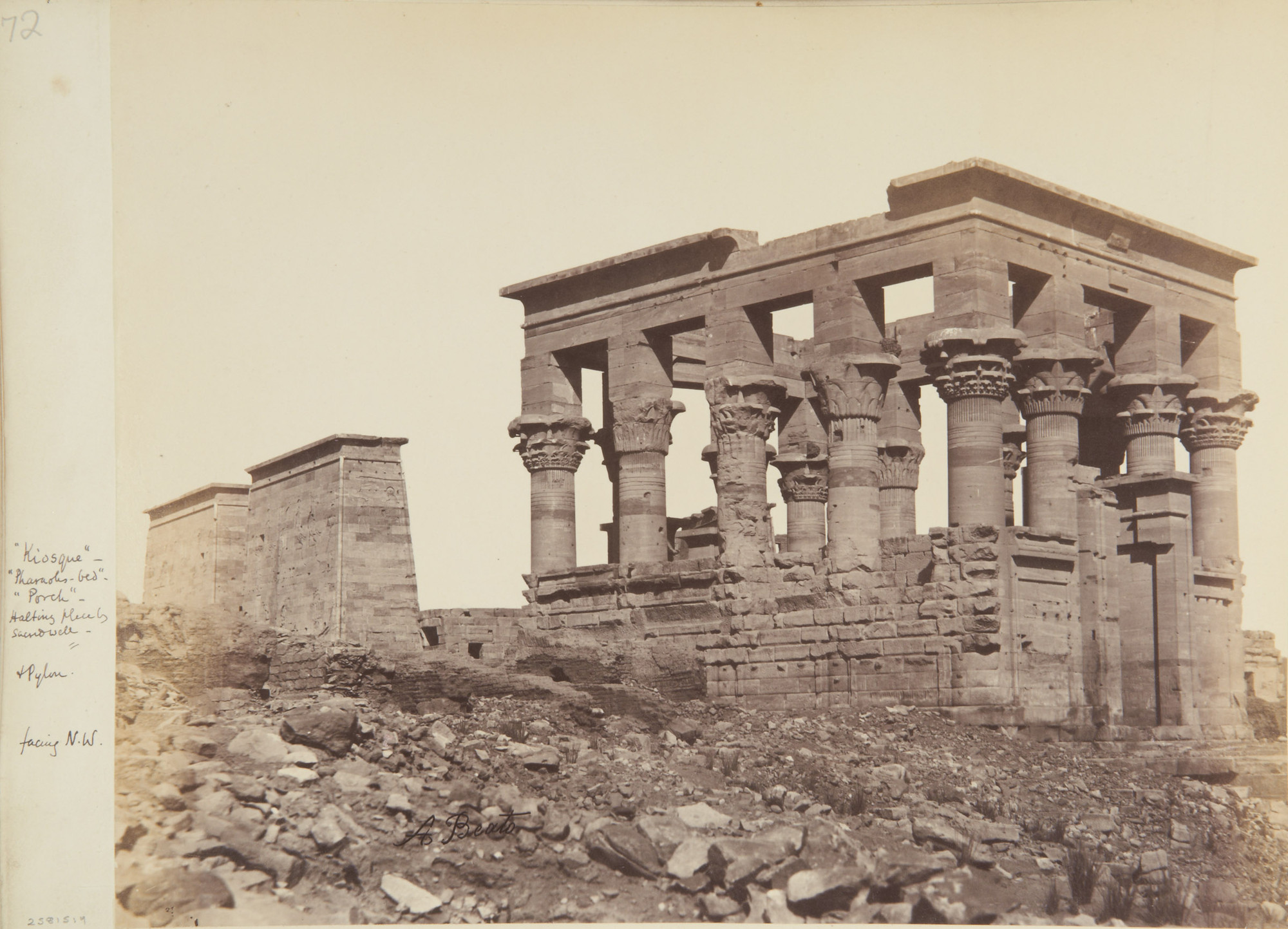 Photograph of the Kiosk of Trajan at Philae: hall of five columns in four rows, with lintels; pylons to left, behind; rubble in foreground