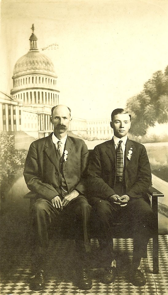 Arcade portrait of two men with their medals infront of a Capitol Building background