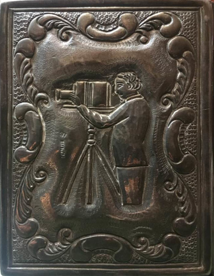 Silver business card case with the design of a daguerreotypist based on an early advert in Argentina