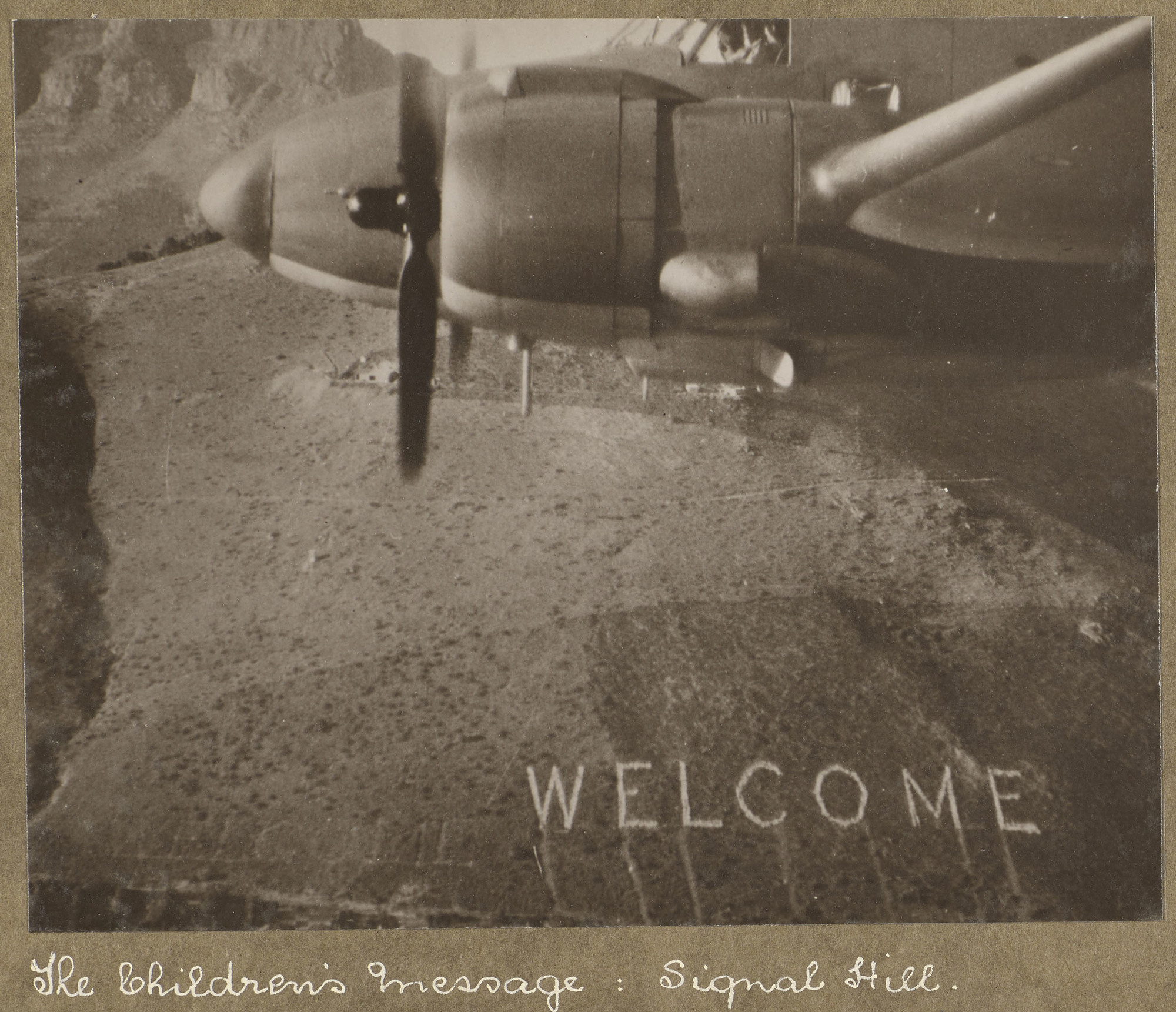 Photograph of an aerial view on Signal Hill, South Africa. 'WELCOME' has been written on the hillside. The aeroplane's propeller features in the upper area of the photograph. The message was written by children from the local area.