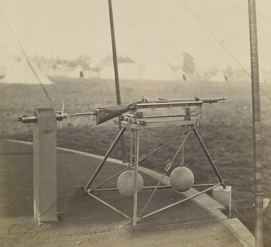 The rifle is seen set up on a mechanical rest and ready to be fired by The Queen at the inaugural meeting of the National Rifle Association on Wimbledon Common. The cord, pulled by The Queen to fire the rifle, can be clearly seen. Photographer's credit on the mount and numbered on the mount in pencil, 'No.8'. The Whitworth rifle was invented in 1859 by the engineer Joseph Whitworth (1803-87) as a possible replacement to the Enfield rifle, which had revealed many shortcomings during the Crimean War. It was still new and relatively unknown at the time of this meeting. The rifle that was fired by the Queen - and the target she shot - have been preserved by the National Rifle Association. Queen Victoria opened the first meeting of the National Rifle Association by firing a fixed rifle at a target set up 400 yards away. The association was formed in 1859 out of several Volunteer regiments that were emerging across Britain in response to the possibility of war with France. The first meeting was held on Wimbledon Common with the intention of promoting rifle-shooting.