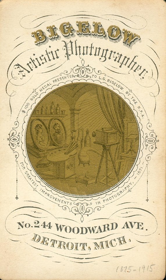 Backmark on a cabinet card showing awards to L.G. Bigelow, Artistic Photographer