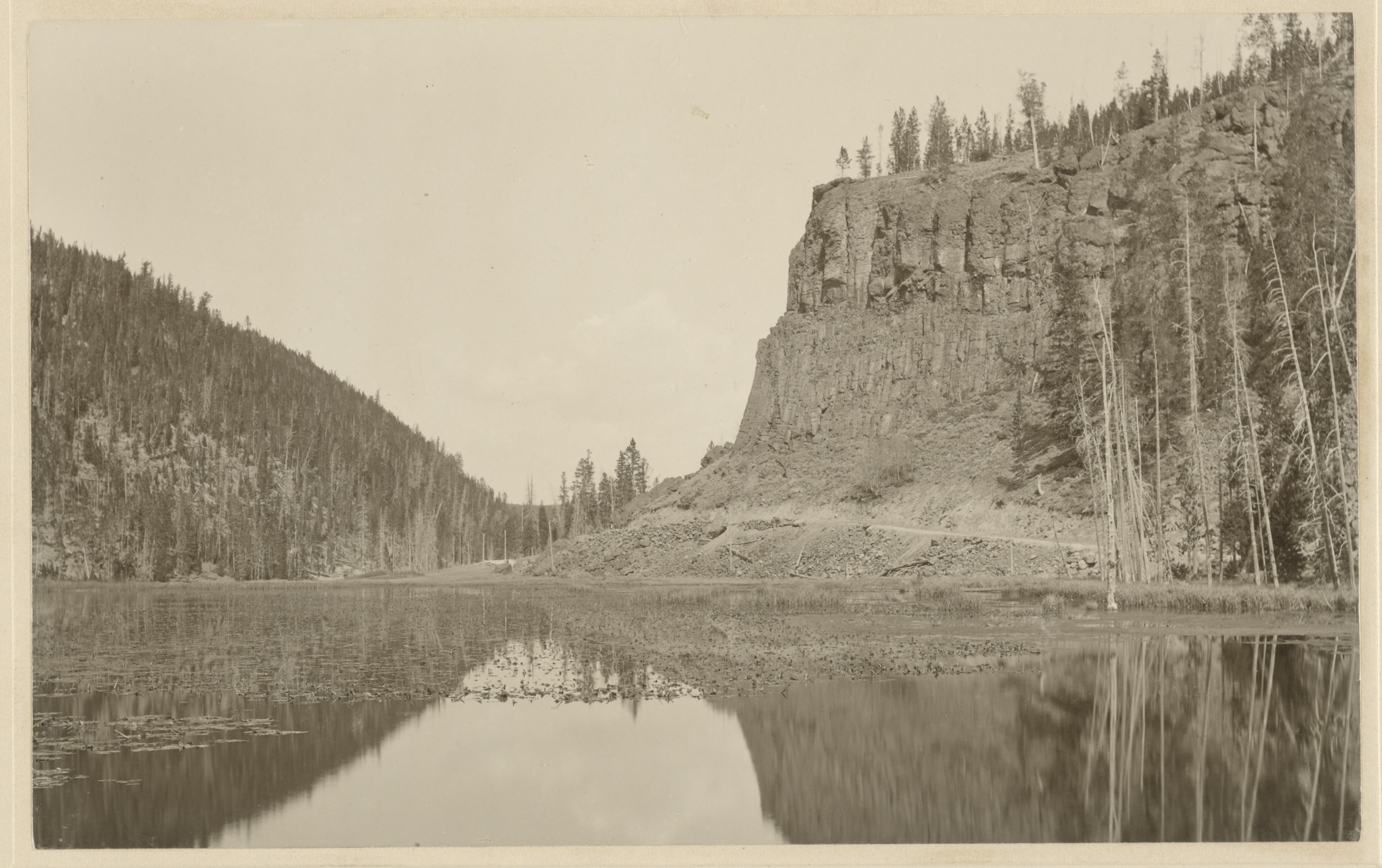 Landscape view taken from the lake at the base of Obsidian cliff, with the cliff's sheer rocky face at the right side of the frame and a high sloping hill densely lined with trees at the left side of the frame. Lily pads rest on the surface of the water, and the landscape is relfected upon it.