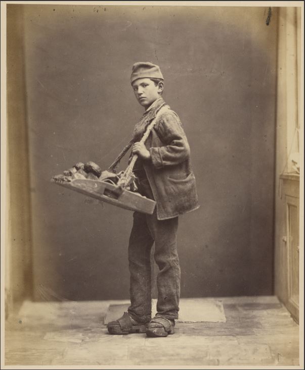 Portrait of a boy carrying a full wooden tray around his neck. The boy is wearing a hat and sandals.