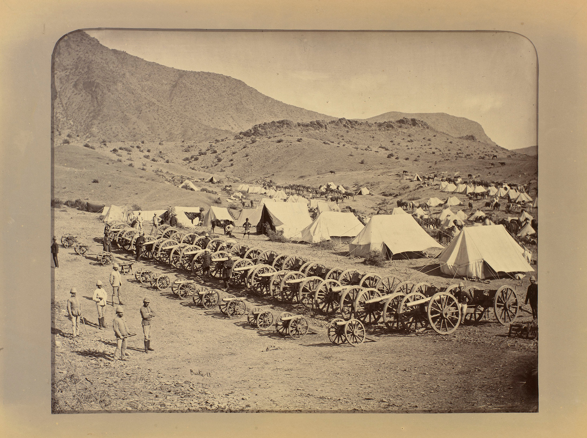 Photograph of guns captured from the Fort of Ali Masjid stored at a military camp on Shagai Heights, a plateau at the edge of the Khyber Pass. In the foreground there are two rows of large gun carriages with a row of smaller gun carriages in front. Soldiers are standing around the guns and there is a camp behind where horses are grazing outside the tents. There are mountains behind. The photographer John Burke travelled with the Peshawar Valley Field Force during the Second Anglo-Afghan War (1878-80), one of a series of conflicts between Britain and Russia over control of Afghanistan. His images from the war capture landscapes, key strategic sites and soldiers involved in the conflict.