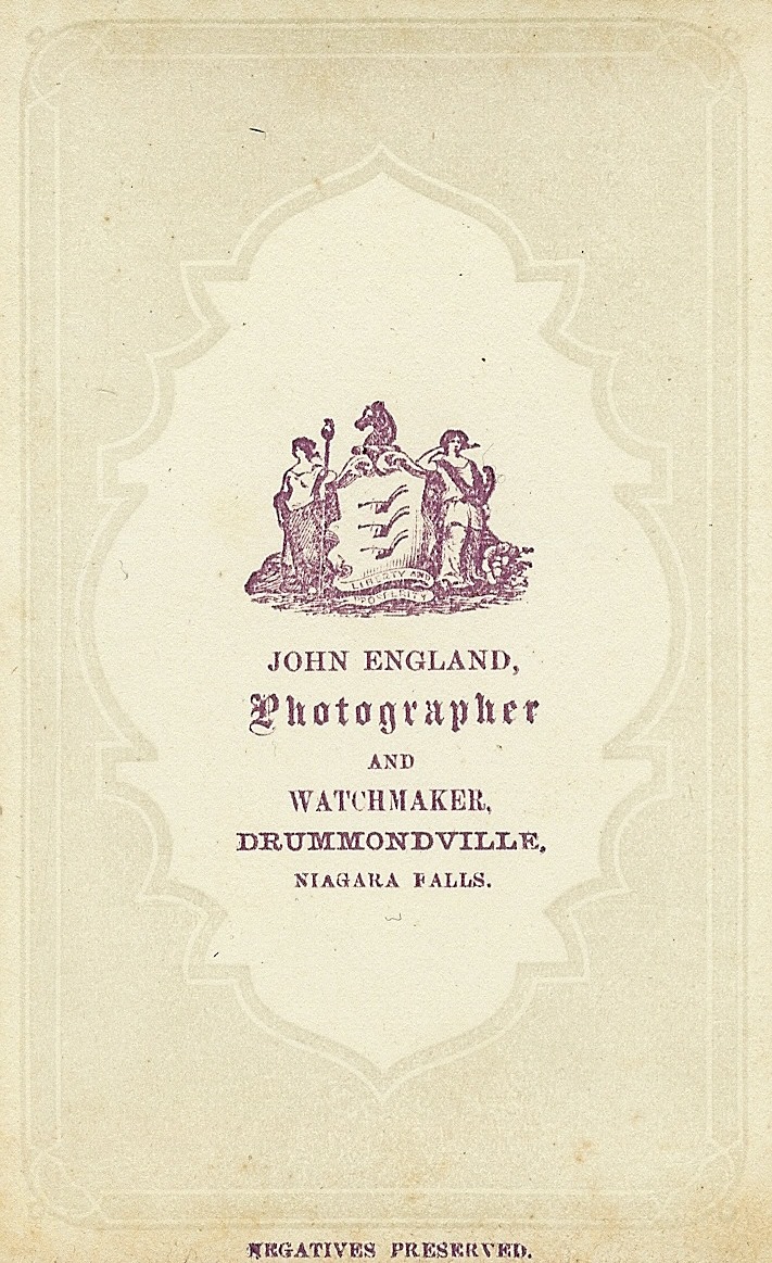 Backmark for "John England, Photographer and Watchmaker, Drummondville, Niagara Falls"