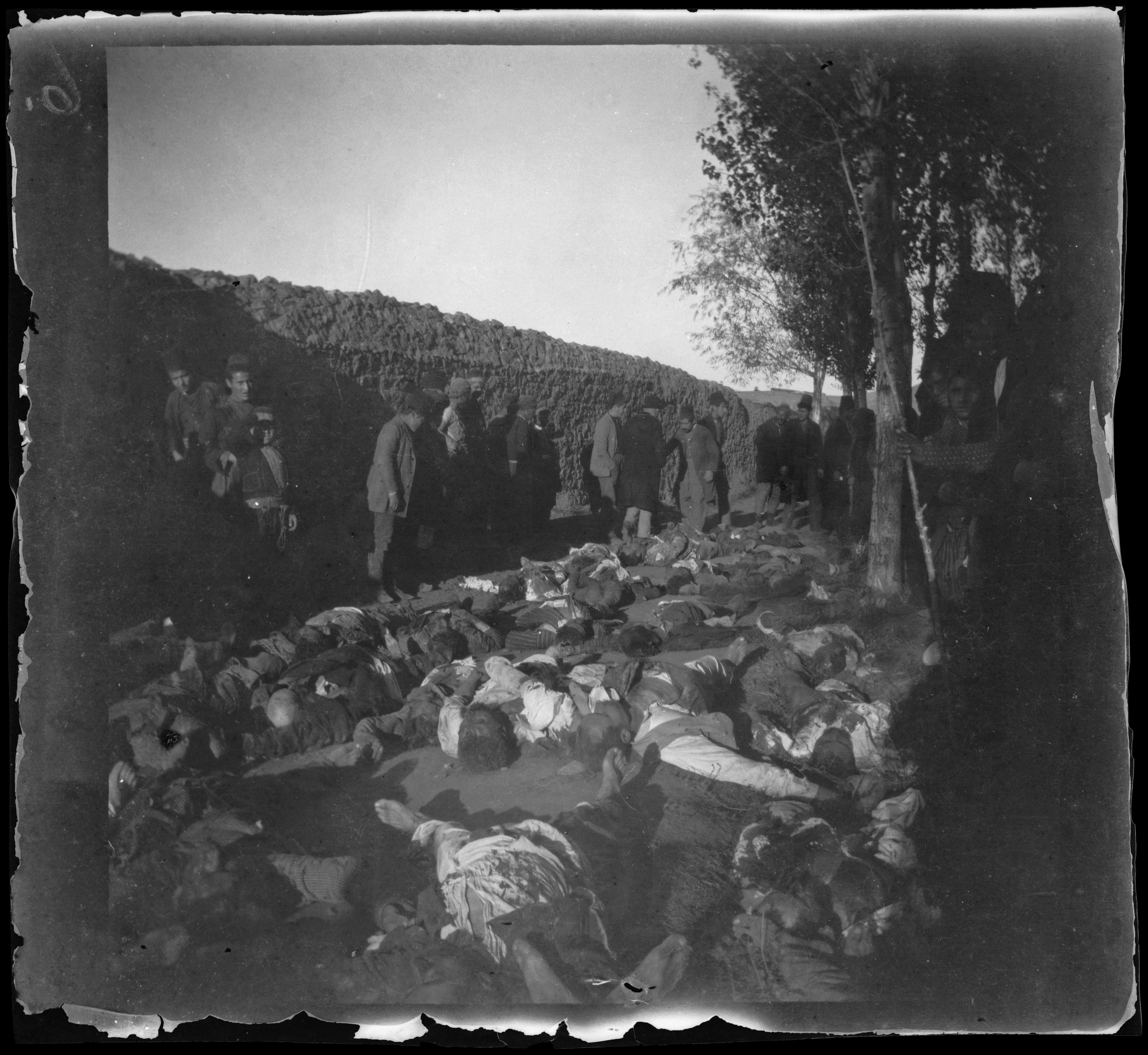 Photograph of the bodies of Armenian massacre victims laid out on the ground between a wall and a stand of trees in the Armenian Cemetery in Erzurum, with people gathered along the wall.