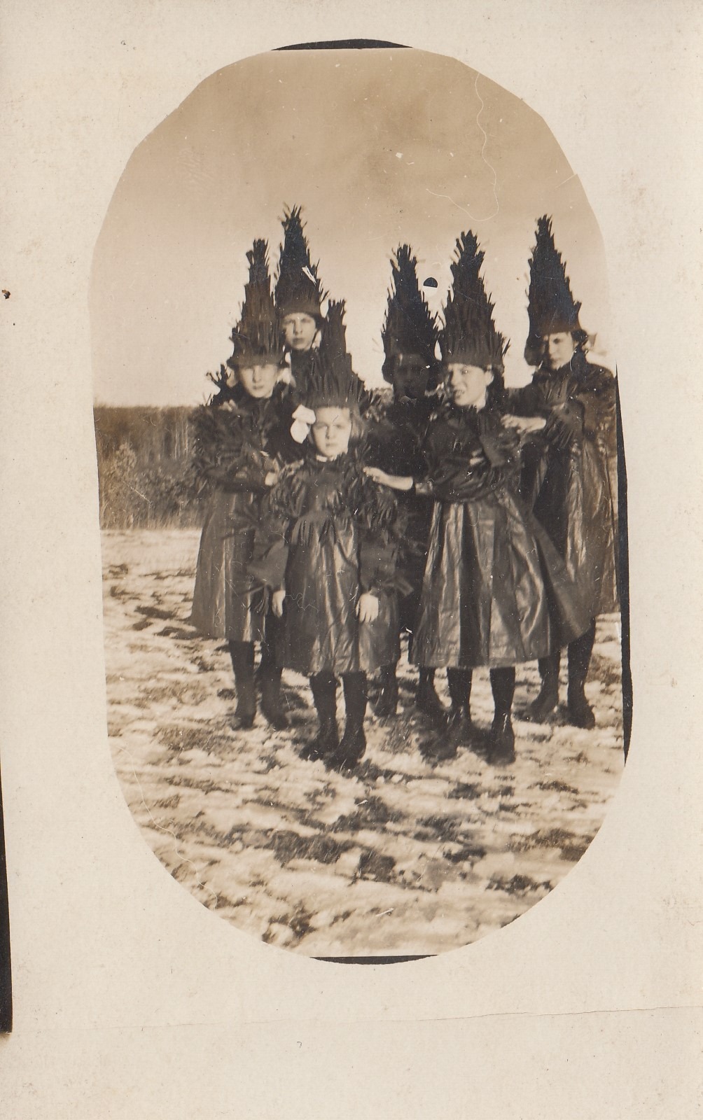 Six children in Christmas tree outfits standing in the snow