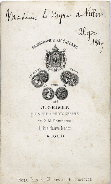 Carte de visite, back Private collection of Michel Mégnin Dated 1869 in hand written text on reverse. Includes with imperial blason and medals won by Alary-Geiser "Photographie Algerienne" whose name still appears. The address of the branch in Bone is not included. It is difficult to say which of the two "J. Geiser" this card relates to - Jean or James.