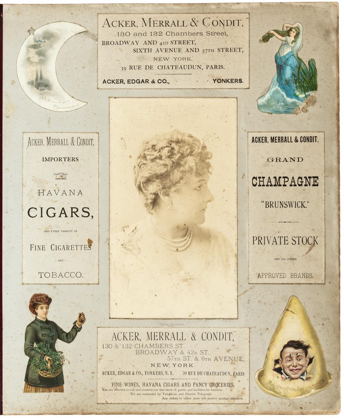 This monumental volume was created by the prominent New York photographer, Napoleon Sarony. Each side of the 23 thick board pages contains a matted albumen photograph and four matted advertising cards. Of the photographs, 42 are large portraits of notable actresses. Portraits of Grover Cleveland and his Vice President, a portrait of the celebrated coronet player Liberati, and a photograph of the Owen paper-making establishment (possibly the producer of this album) are also included. Of the 184 advertisements, 91 are photographs, the others are either engraved, lithographed, or chromolithographed. The large photographs measure 11½ x 6¾ inches (292 x 171 mm.), while the advertisements are mostly 8 x 4 inches (203 x 102 mm.) or the reverse. Produced to sit in the lobby or bar of pre-eminent hotels, art albums were a kind of concierge service, created to entertain and inform visitors of the businesses and pleasures associated with these exclusive establishments. This album is filled with seductive portraits of the stars of the Belle Epoque, including Fannie Davenport, Adelina Patti, Lilly Langtry, Ada Rehan, Lotta Crabtree, Modjeska, Ellen Terry, and Lillian Russell, plus dozens of advertisements for goods and services. All were posed and photographed by the greatest photographer of the American theater, Napoleon Sarony (1821-1896). He established a studio on Broadway in New York in 1866 and for the next thirty years Sarony photographed virtually every actor and actress working on the New York Stage. The Hoffman House was located on Broadway between 24th Street and 25th Street. Built in 1864, it quickly became the informal meeting place for the Democratic Party in New York. Grover Cleveland stopped there frequently, and was living there when he was elected to the Presidency for his second term. General Benjamin Butler and General Winfield Scott made the hotel their home on several occasions, and William Randolph Hearst lived at the Hoffman when he first came to New York City. Edward S. Stokes, who shot financier James Fisk, Jr., became a partner in the hotel, serving as general manager until 1897. The elegant barroom with its shocking painting Nymphs and Satyrs by Bougereau, became a major tourist attraction. Due to their large size and small number, hotel art albums" rarely survived. We have located two others in public institutions. One for the Parker House of Boston is at Brown University, and the other for the Ponce De Leon Hotel of Saint Augustine, Florida is at Jacksonville University.