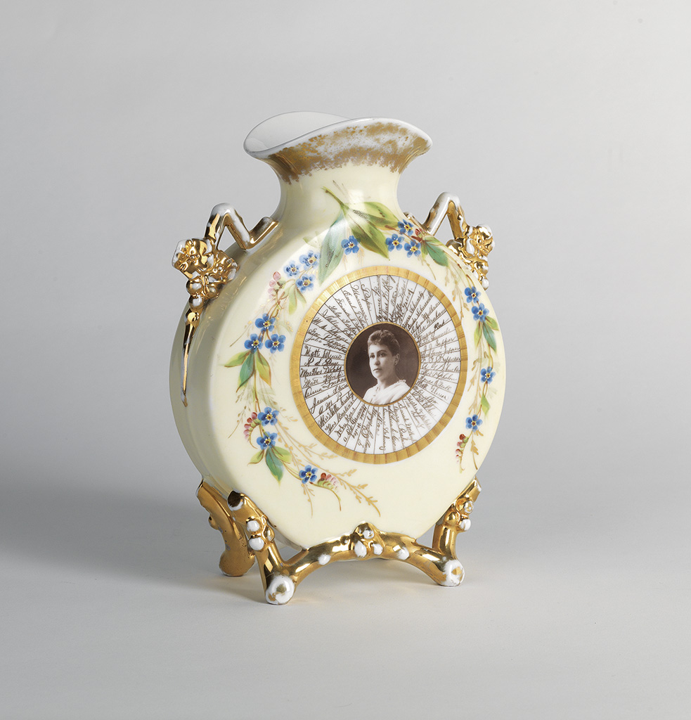 Hand-painted vase with a transfer photograph on porcelain of a young woman along with the signatures of family members and friends