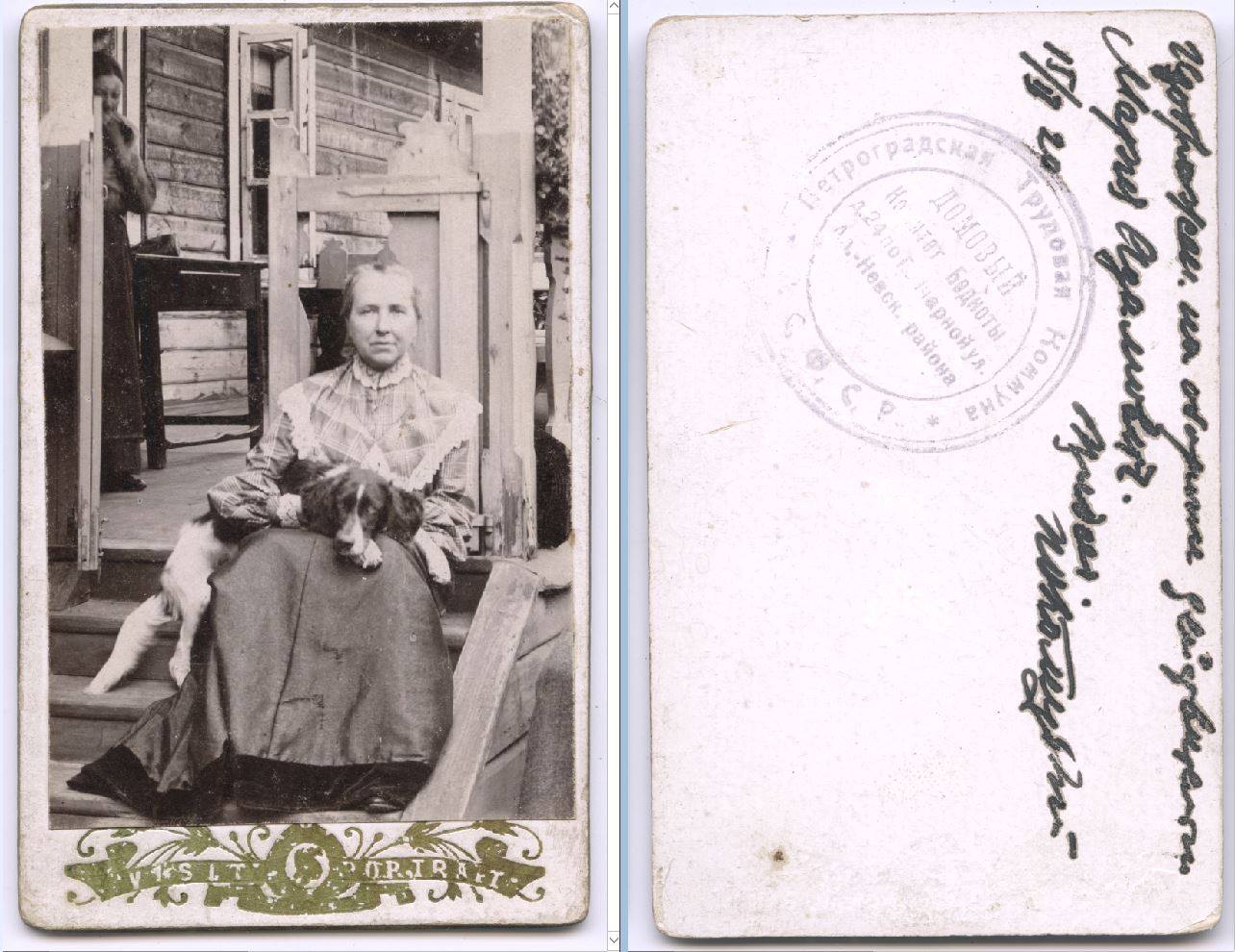 A woman with her dog - Identity card, certified by the House Committee of the Poor of the Petrograd Labor Commune. 1920